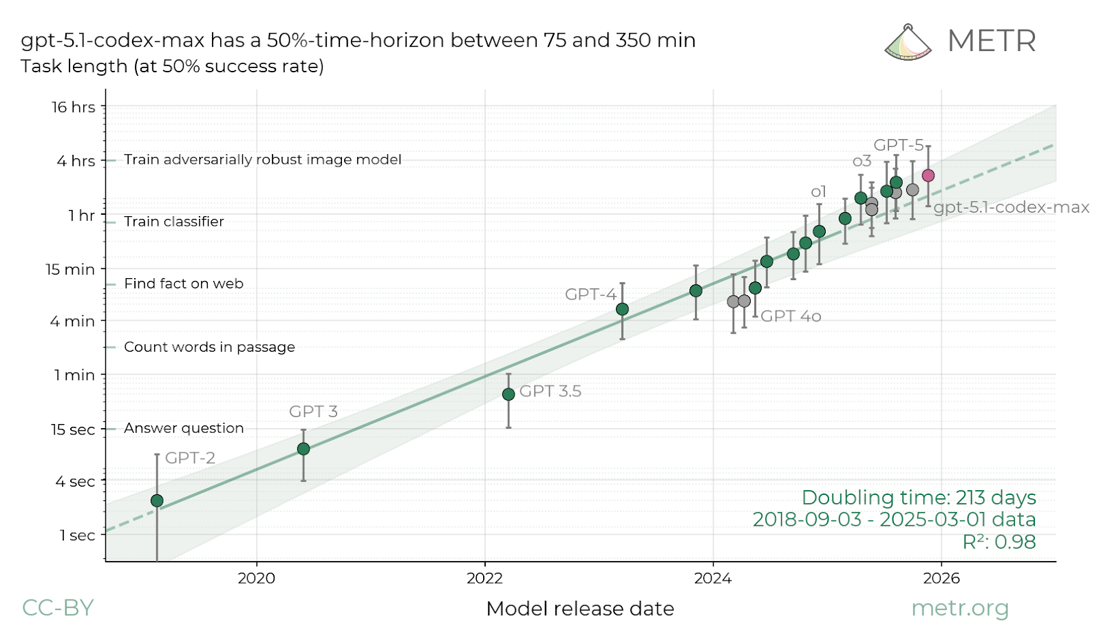METR found that the capabilities of GPT-5.1-Codex-Max were in line with expectations, and that absent a significant trend break, further development would be unlikely to enable these threat models in the next 6 months, based on the following: