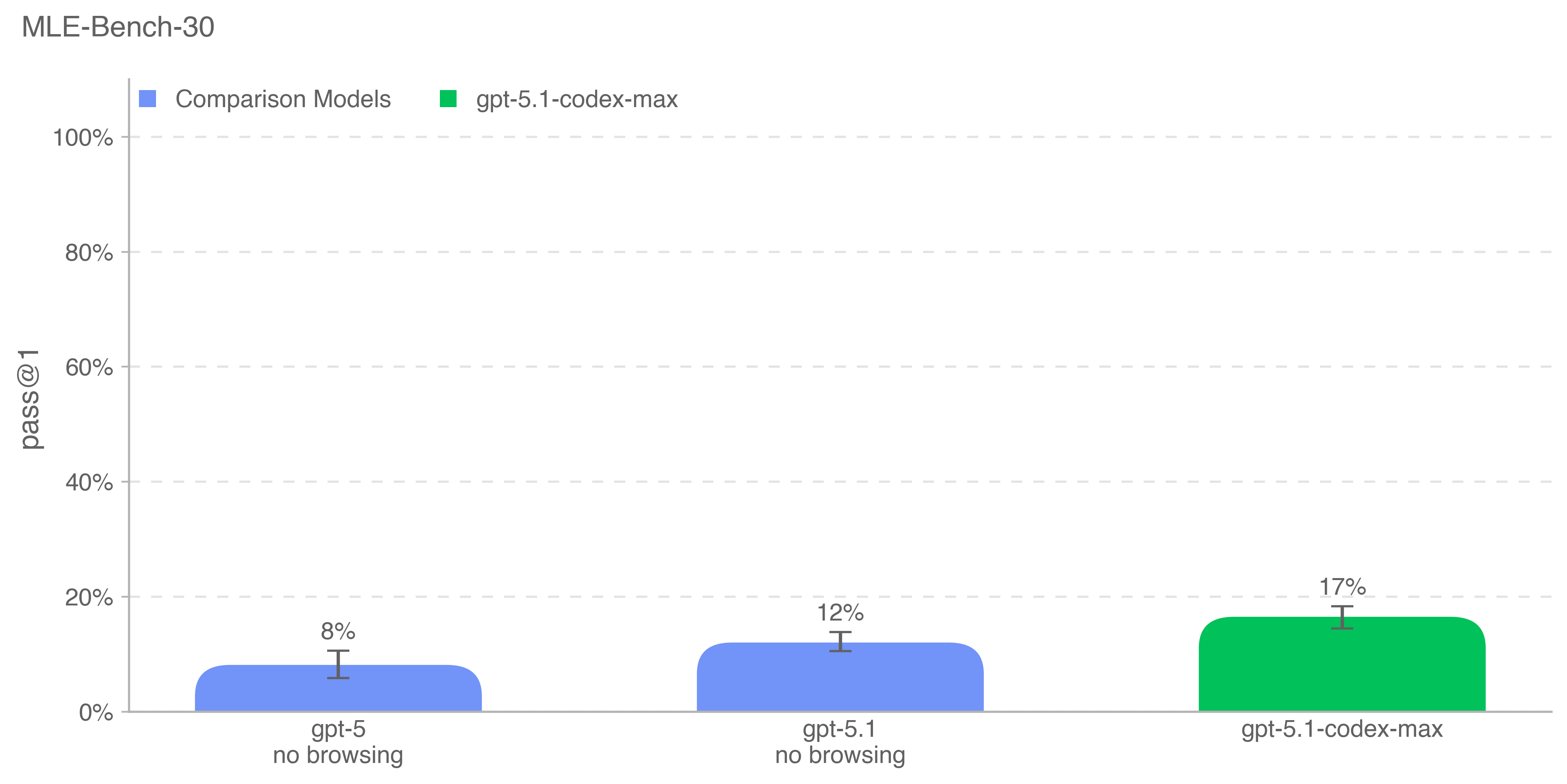 GPT-5.1-Codex-Max makes meaningful gains on this evaluation relative to both GPT-5 and GPT-5.1.