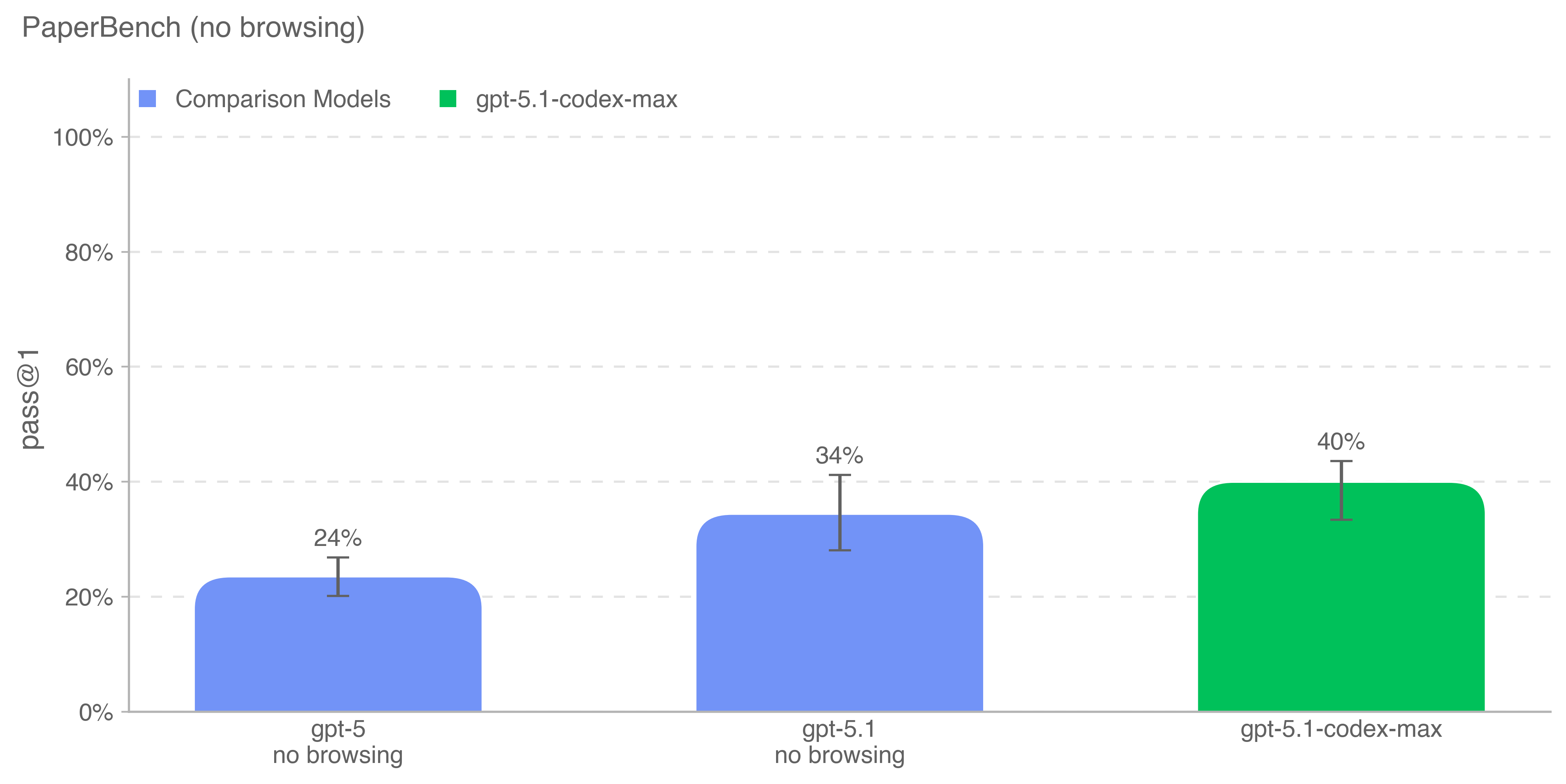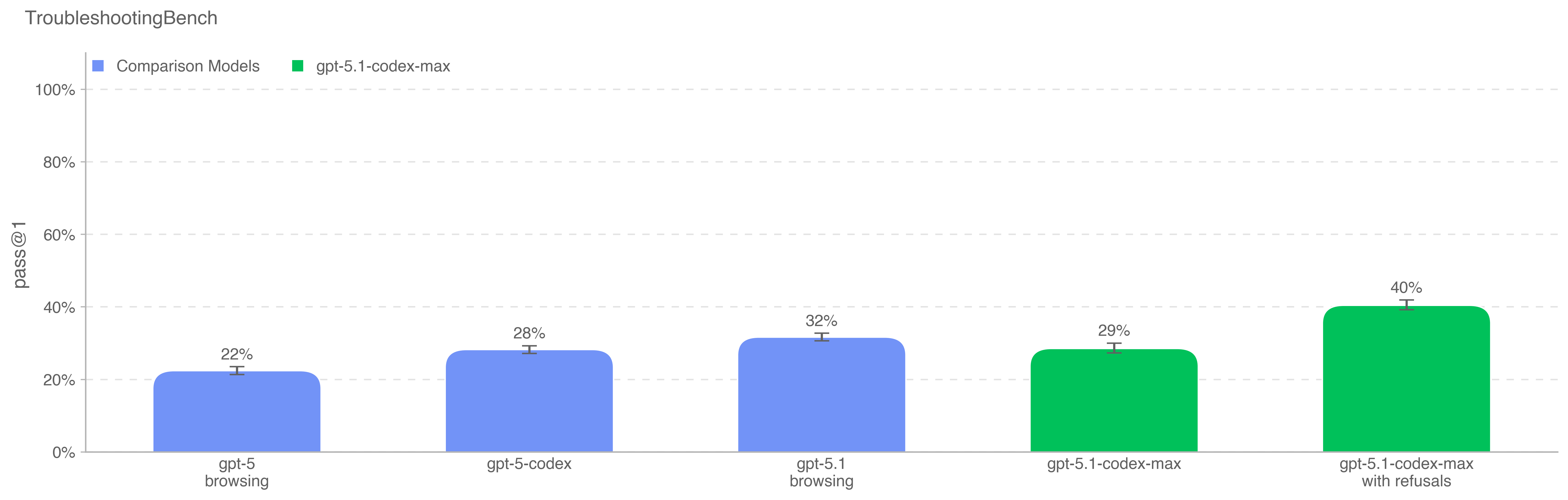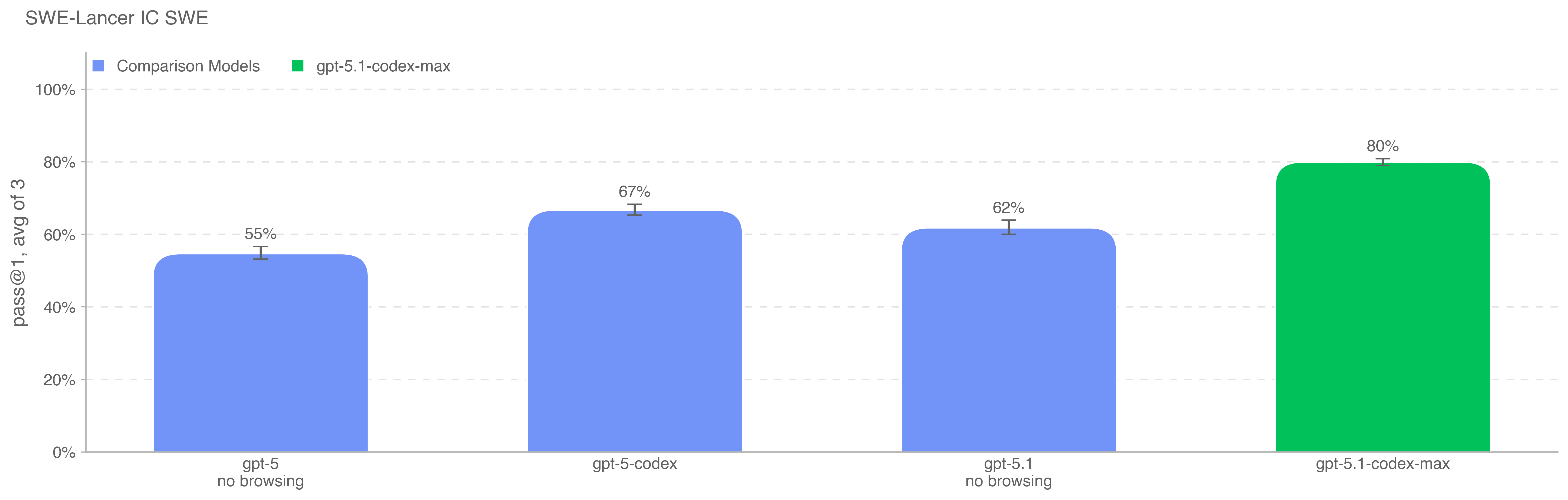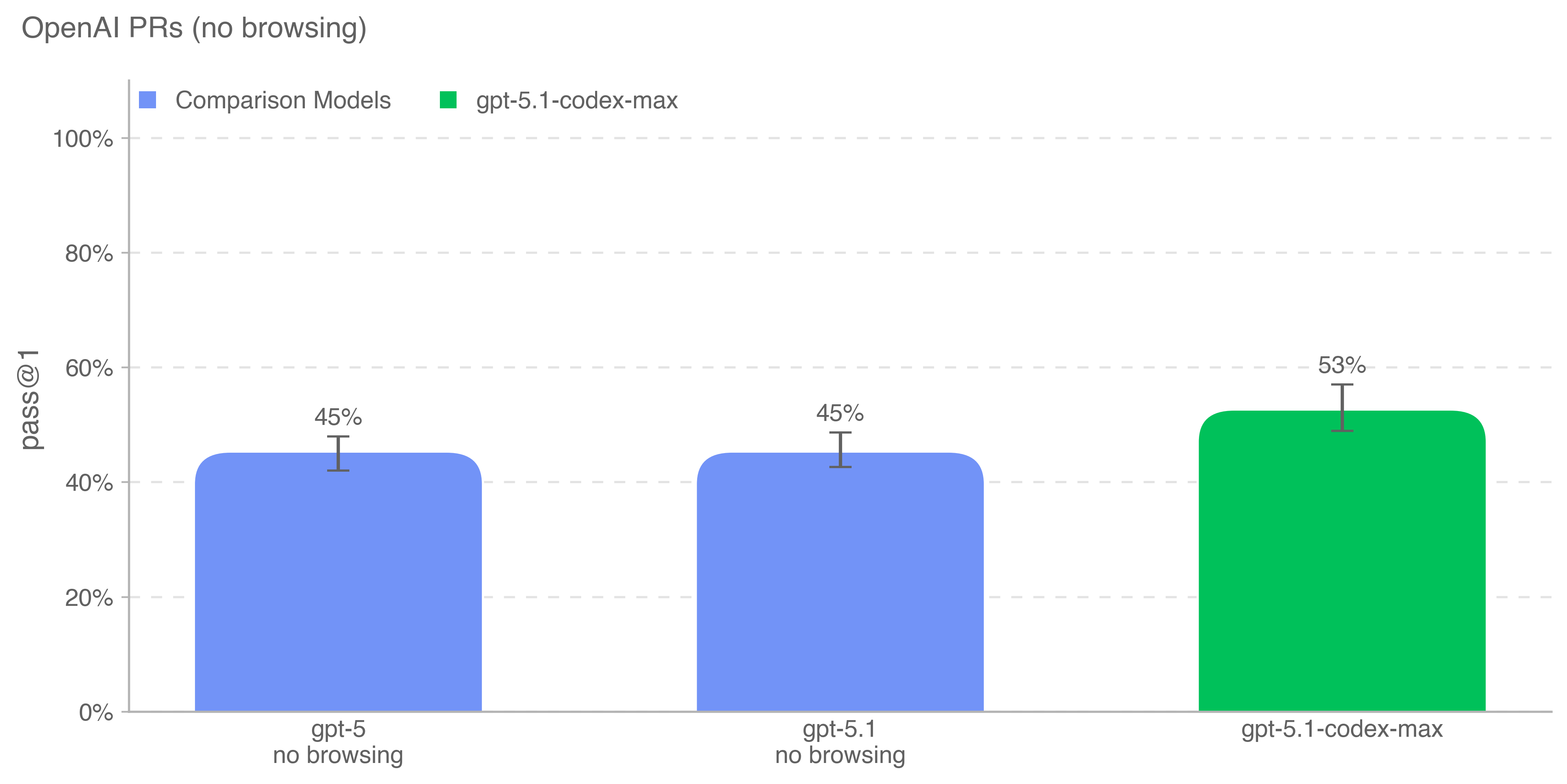 GPT-5.1-Codex-Max exceeds the performance of gpt-5.1, setting a new upper bound among our models.
