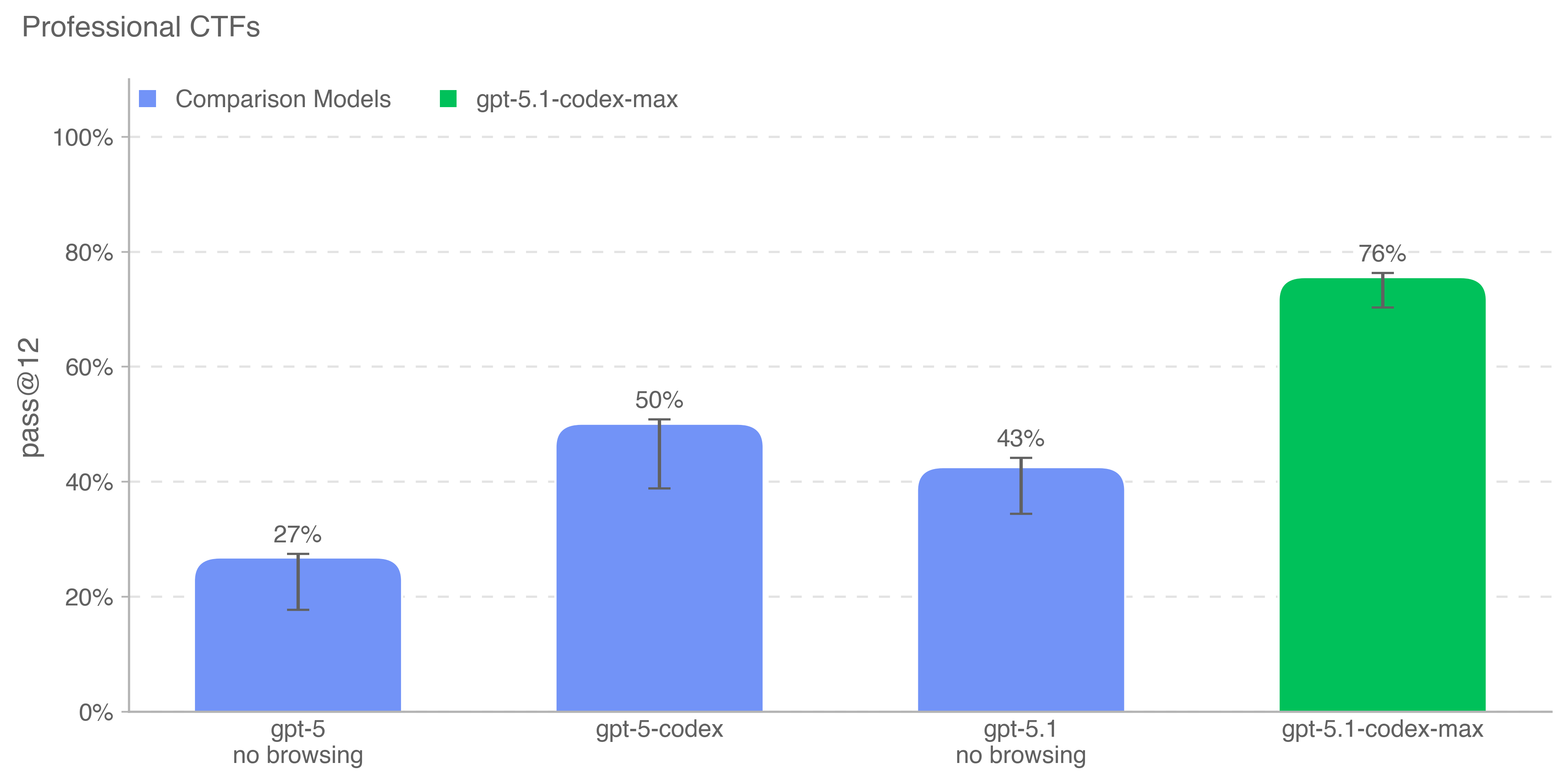 One of the primary causes of the significantly increased performance in the cybersecurity domain for GPT-5.1-Codex-Max is its improved ability to tackle long-horizon tasks since most cyber challenges are limited by exploring many different paths which involve running commands that can produce verbose logs and easily consume the model’s context window. We ran evaluations with the model configured to be able to use up to 10 context windows to ensure proper capability elicitation.