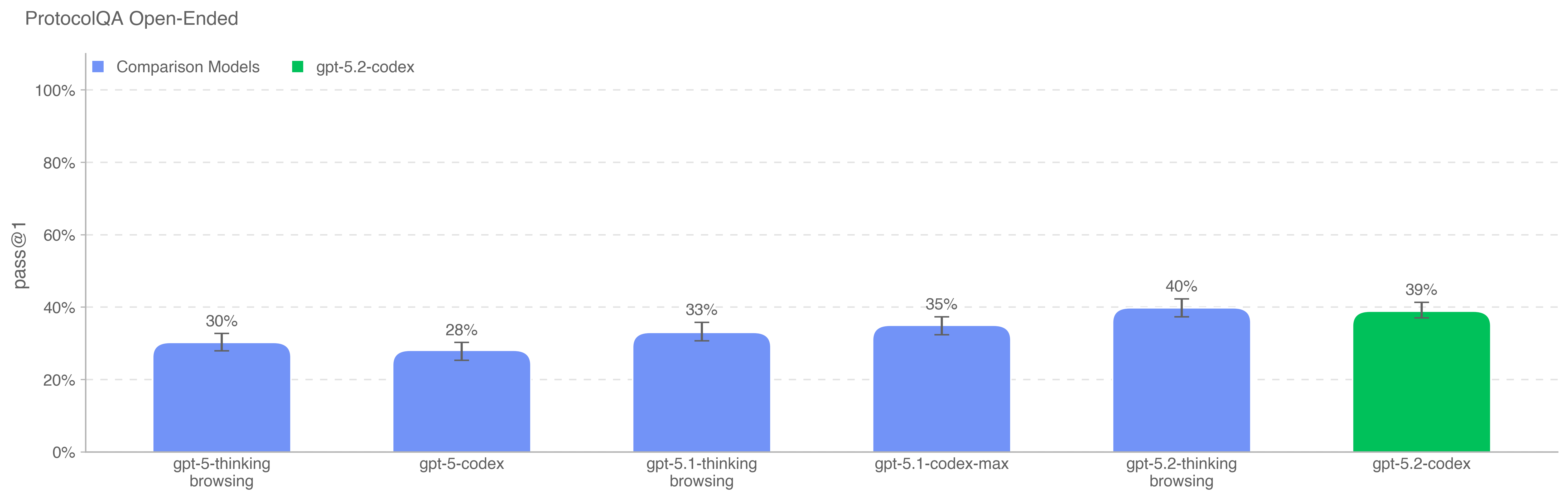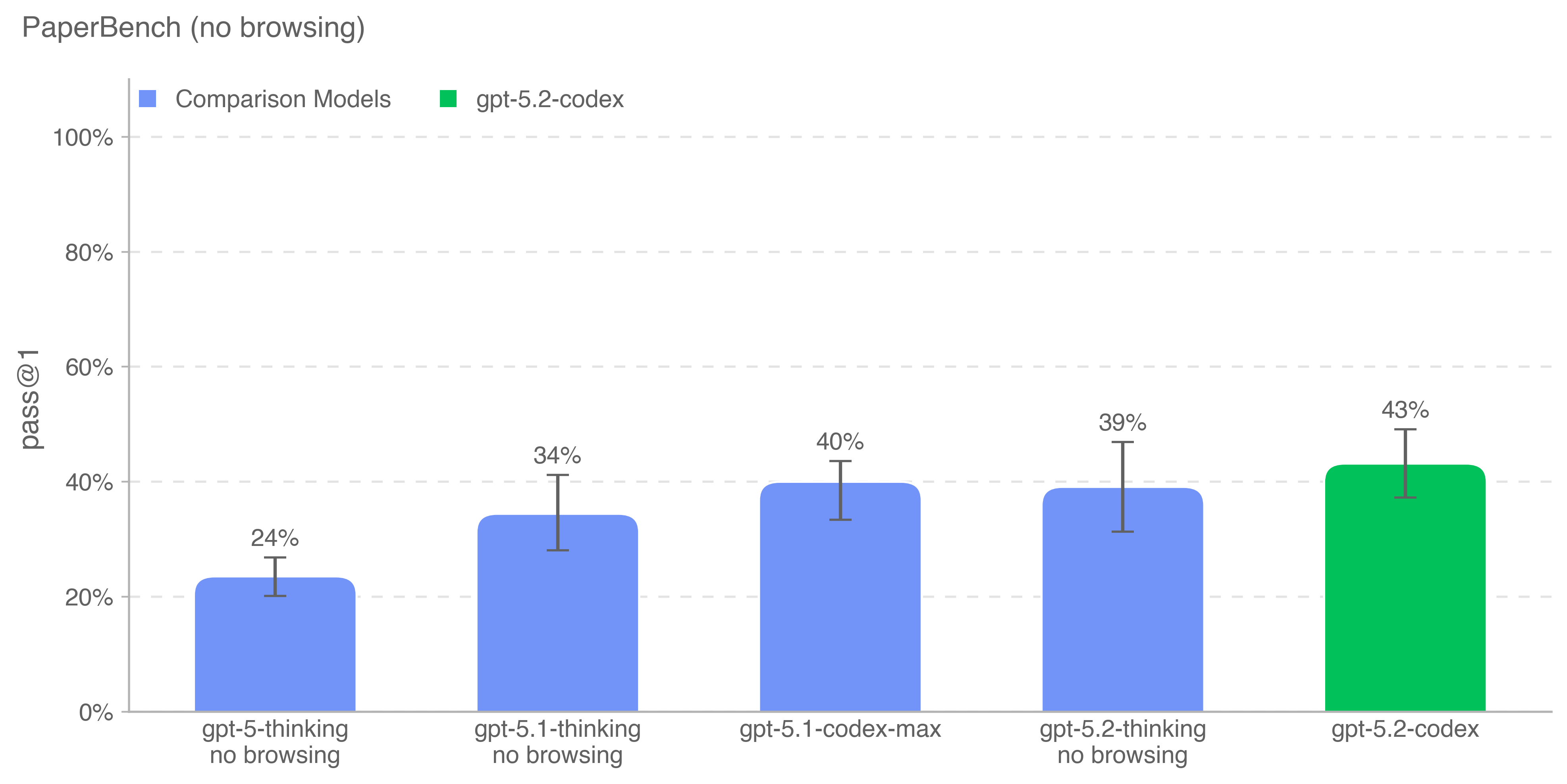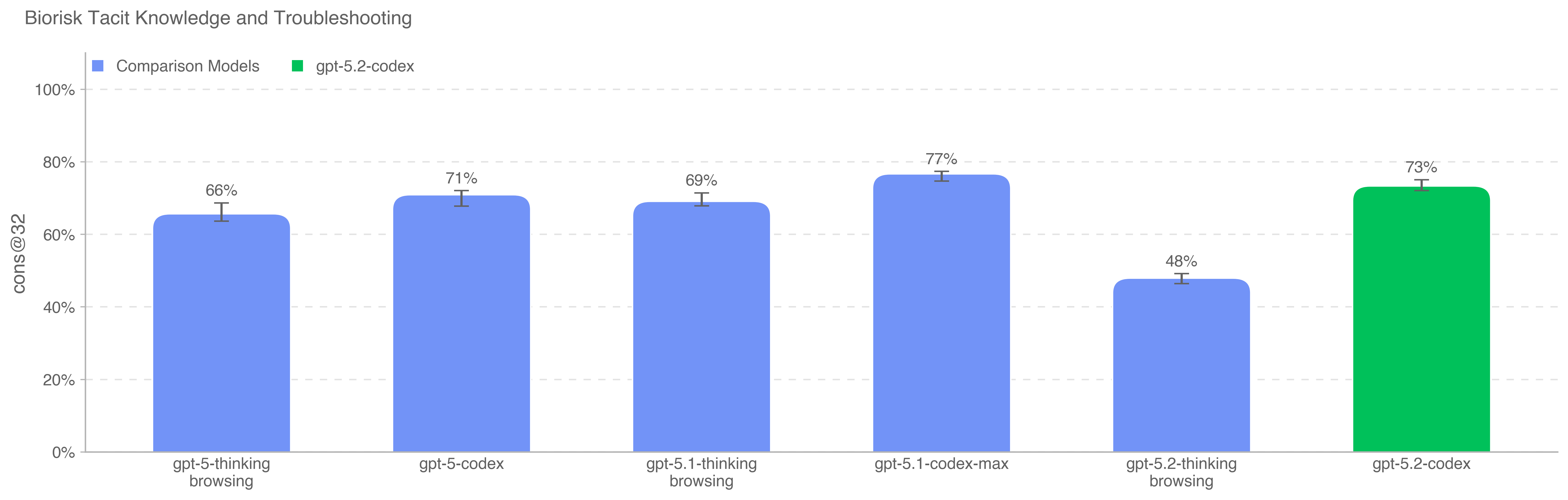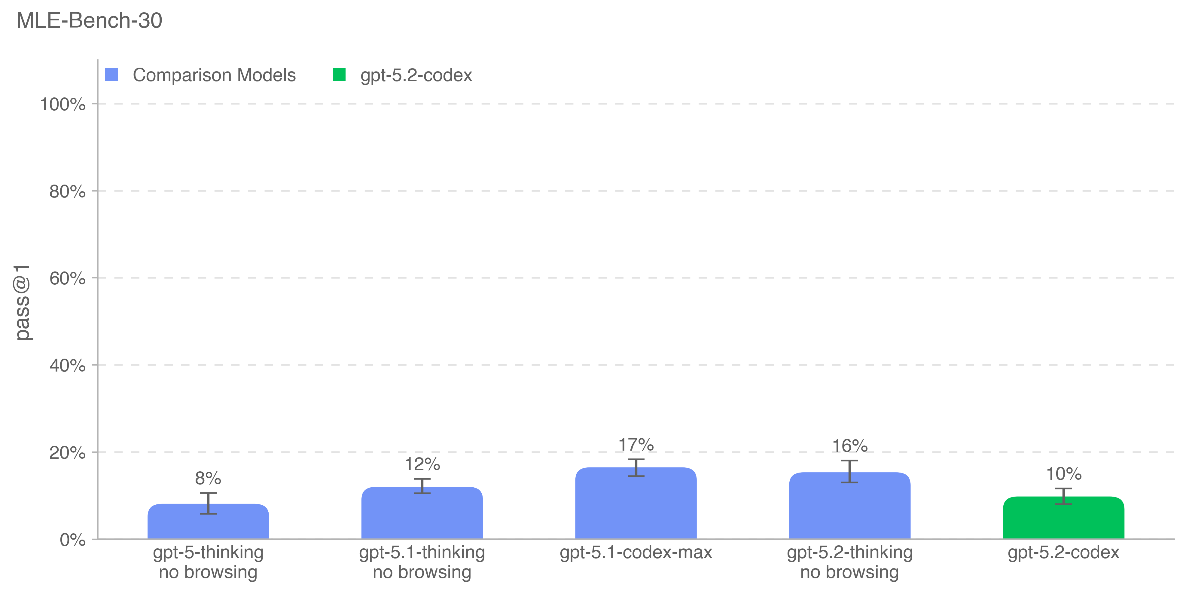 GPT-5.2-Codex performed at a similar capability level to GPT-5.2-Thinking and did not meet our High thresholds. The High capability threshold is defined to be equivalent to a performant mid-career research engineer and performance in the evaluations below indicate we can rule this out for GPT-5.2-Codex.