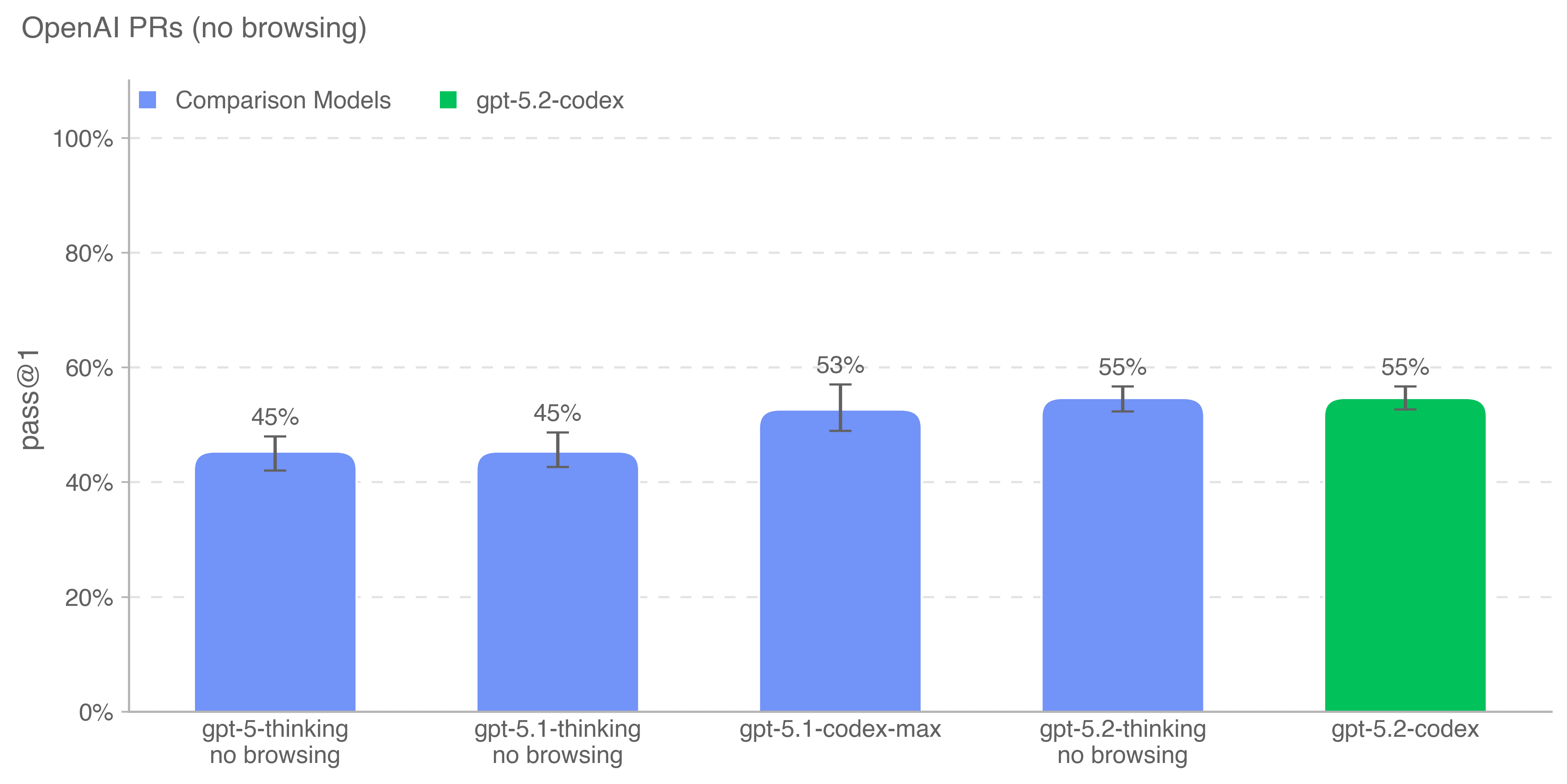 GPT-5.2-Codex exceeds the performance of GPT-5.2-Thinking and GPT-5.1-Codex-Max, setting a new upper bound among our models.