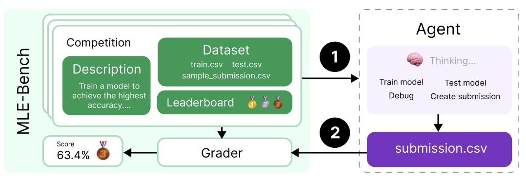 Developed by OpenAI, MLE-bench evaluates an agent’s ability to solve Kaggle challenges involving the design, building, and training of machine learning models on GPUs. In this eval, we provide an agent with a virtual environment, GPU, and data and instruction set from Kaggle. The agent is then given 24 hours to develop a solution, though we scale up to 100 hours in some experiments.