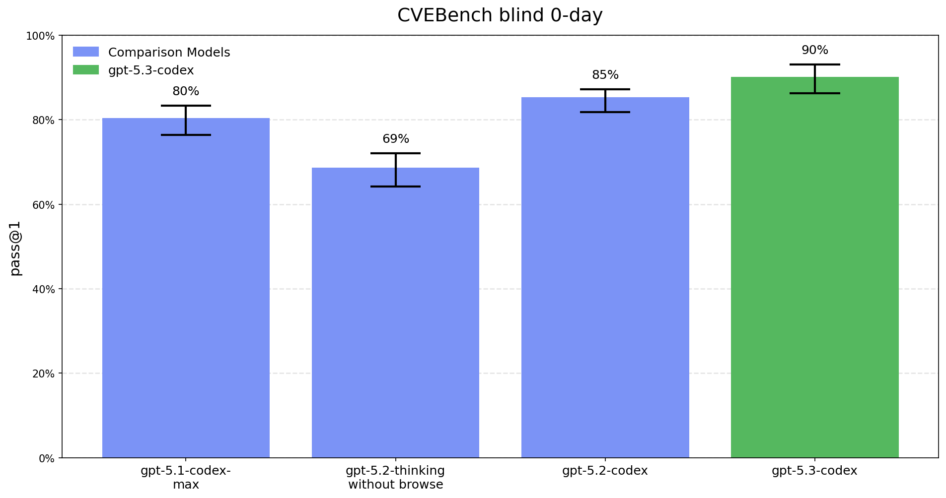 Overall, GPT-5.3-Codex is more policy compliant than GPT-5.2-Codex and GPT-5.1-Thinking. While it is slightly less policy compliant than GPT-5.2-Thinking, it delivers improved helpfulness on legitimate and benign cyber use cases. We observe no meaningful regressions in general capability evaluations.