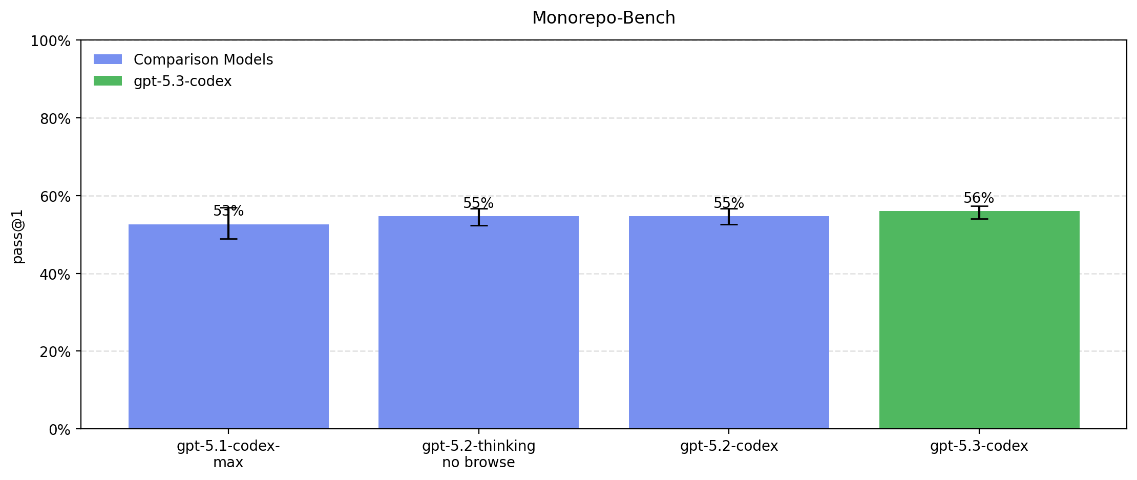 GPT-5.3-Codex scores similarly to GPT-5.2-Thinking and GPT-5.2-Codex on this evaluation.