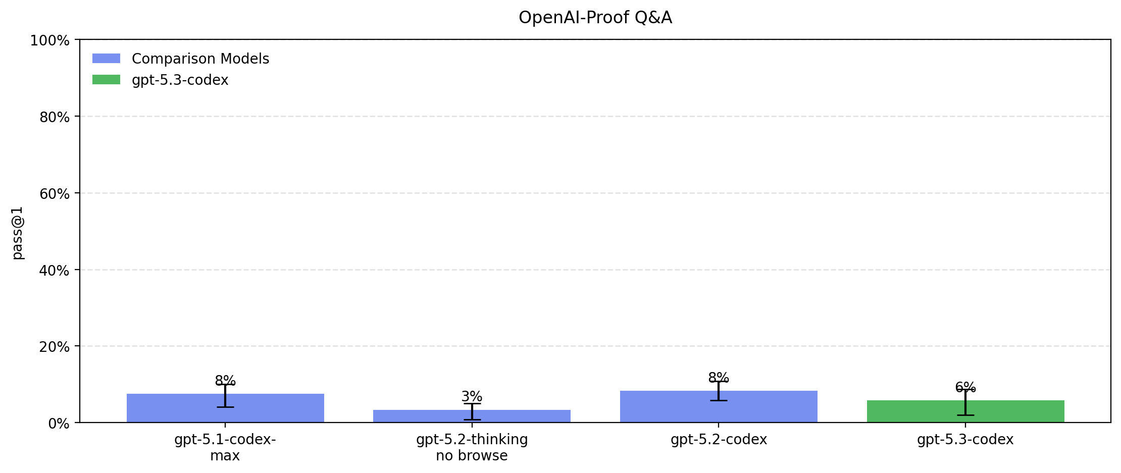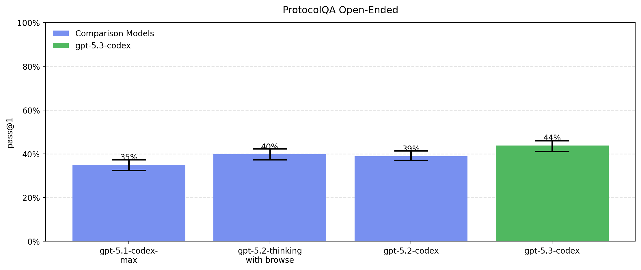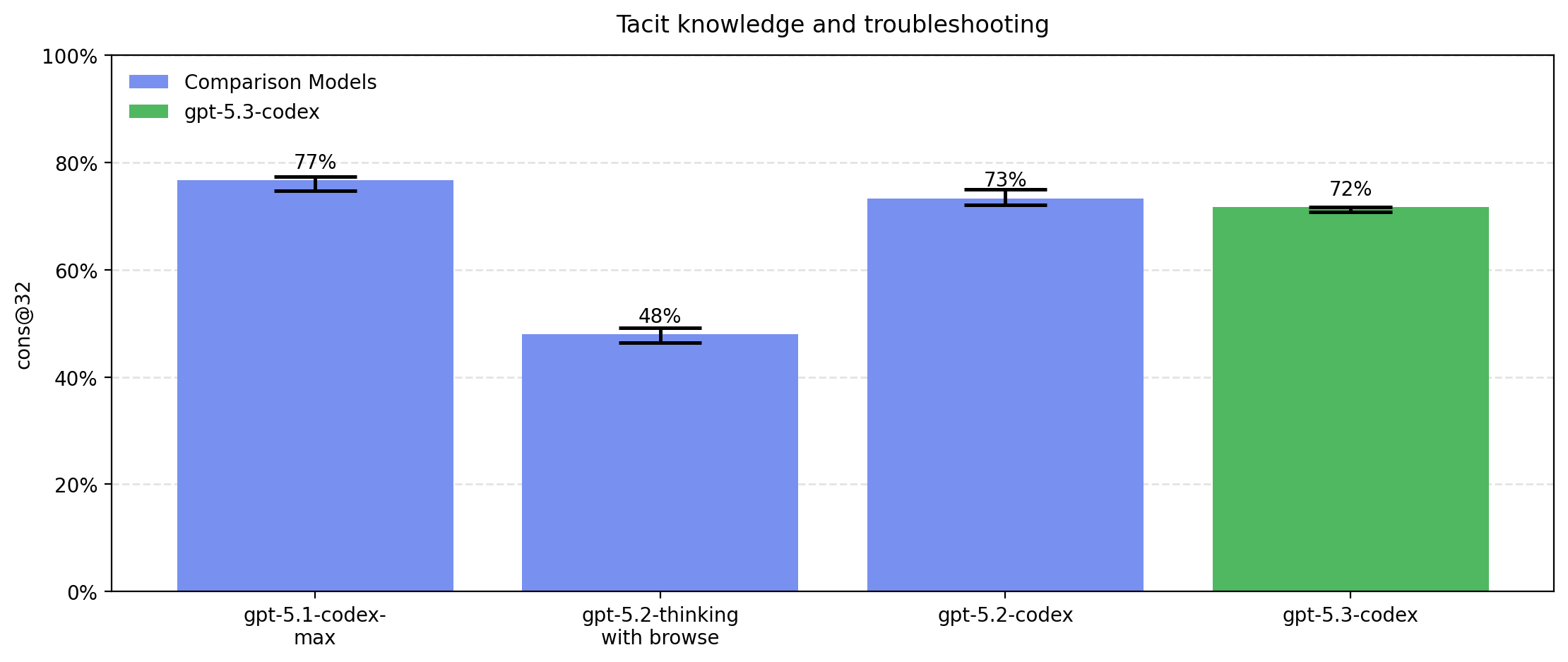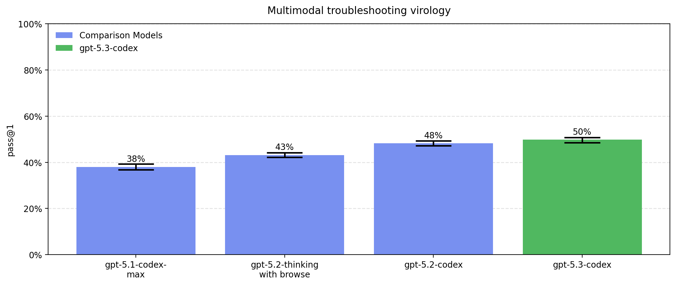 GPT-5.3-Codex performs similarly to GPT-5.2-Codex. We sometimes observe refusals or safe-completions for on bio evals. On the "Tacit knowledge and troubleshooting" eval, the refusal or safe-completion rate is 6% for GPT-5.1-codex, 30% for GPT-5.2-thinking, 0.1% for GPT-5.2-codex, and 8.3% for GPT-5.3-codex. This explains the apparent dip in performance for GPT-5.2-thinking. For all of our other evals, we see <4% refusals or safe completions across all tested models. Internally when determining whether models have crossed capability thresholds we consider refusals and safe-completions as successes to make sure refusals do not lead us to underestimate capabilities.